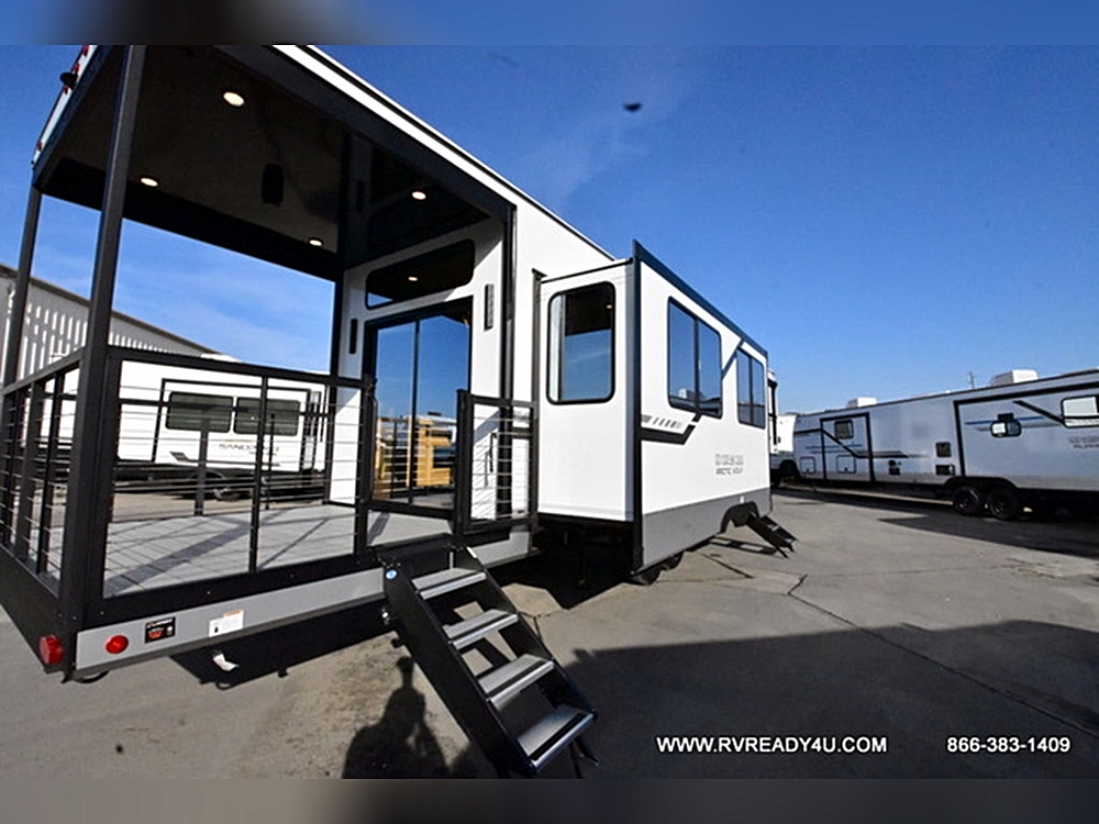 This model’s unique design includes a covered patio rear deck, perfect for immersive outdoor experiences regardless of the weather. A workstation inside suits remote workers seeking productivity on the go.